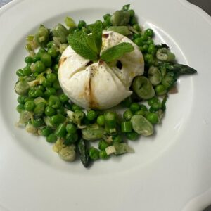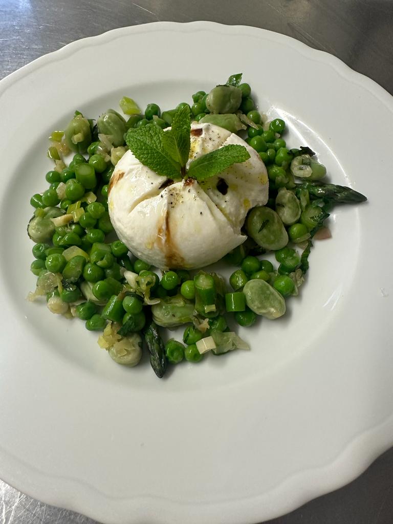 Fresh Burrata Cheese with Asparagus Broad Beans, Green Peas, Spring Onion and Mint (gf, v)