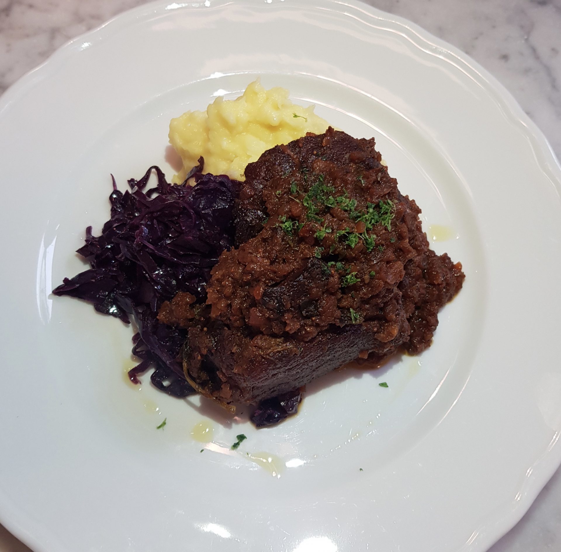 Slow-cooked Pork Shoulder and Prunes Stew, Braised Red Cabbage and Mashed Potato (gf)