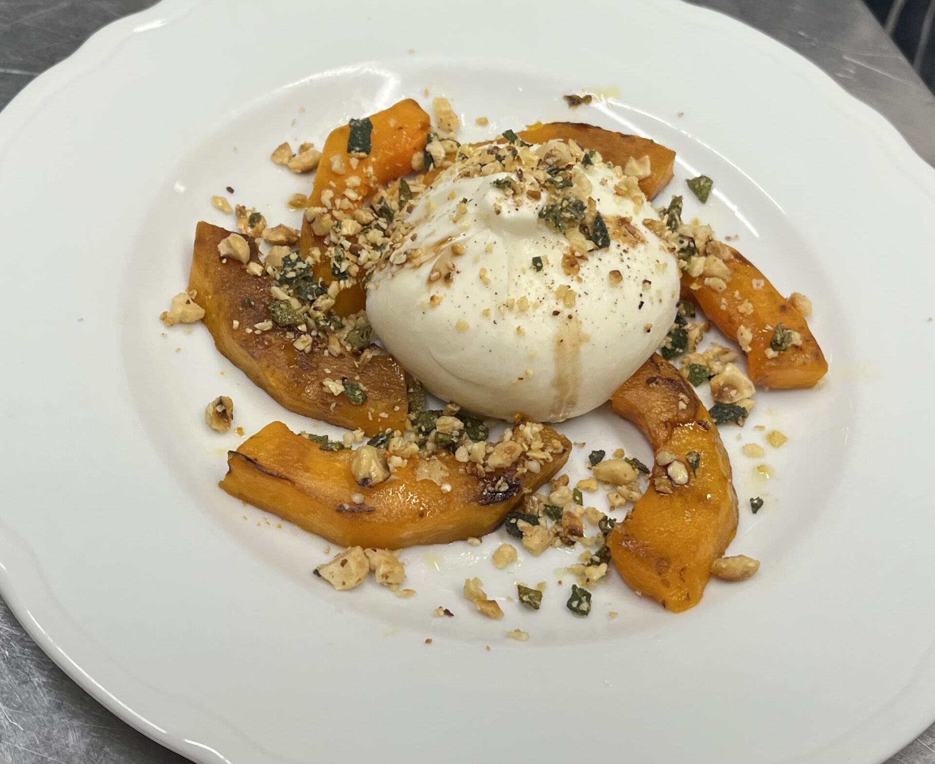Pan Fried Butternut Squash, Fresh Burrata Cheese, Toasted Hazelnut and Sage (gf,v)
